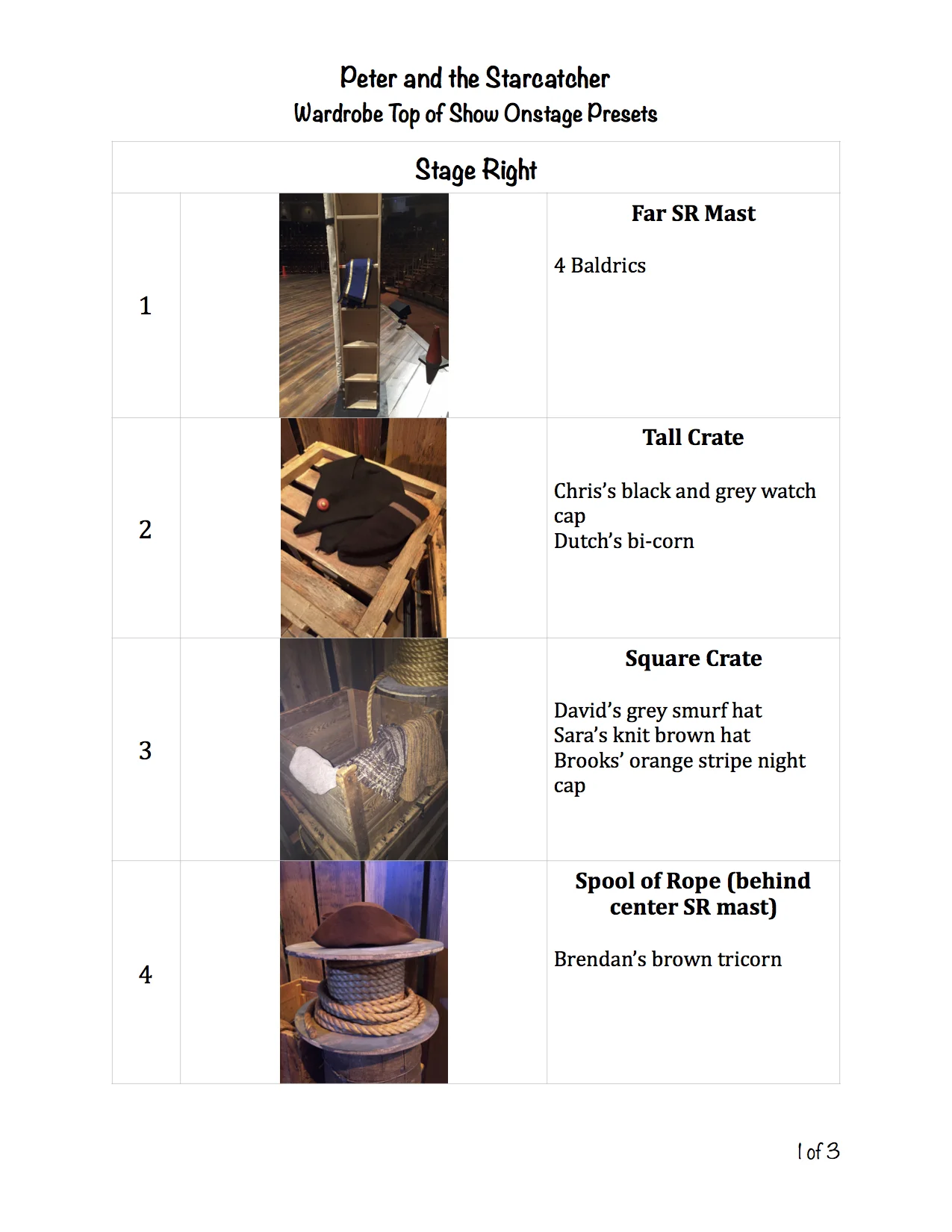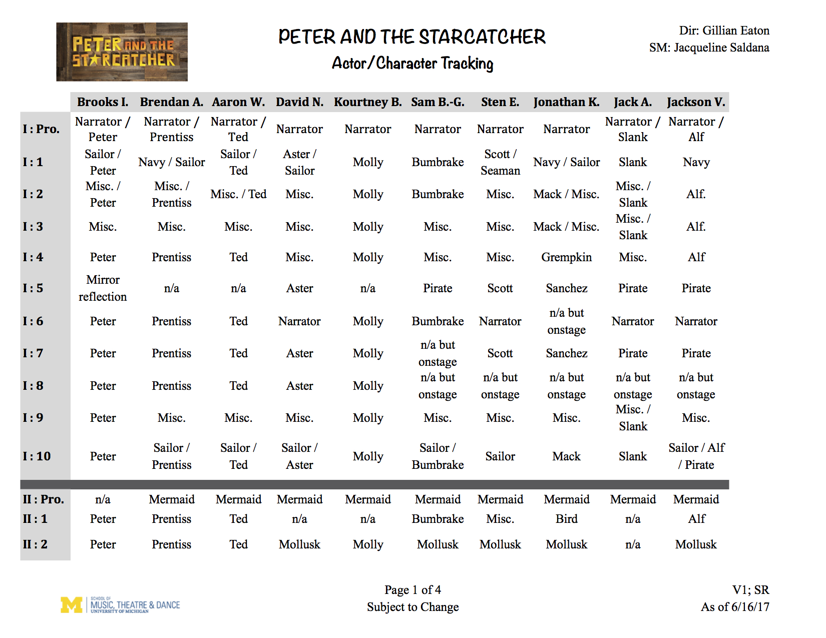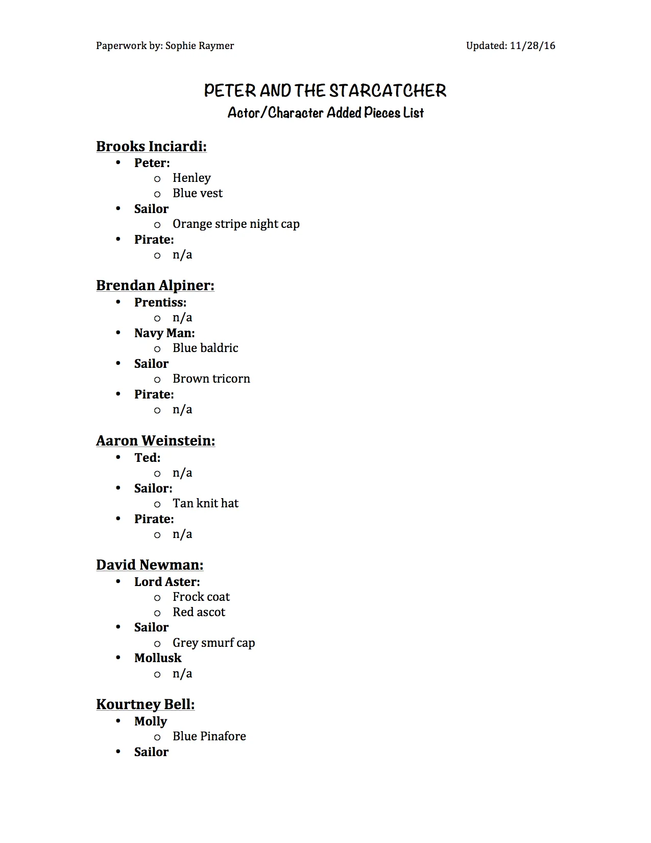In the fall of 2016 I served as one of two First Assistant Stage Managers for University of Michigan's production of Peter and the Starcatcher. My primary duties involved being our production's direct correspondent with the costume shop and costume designers, as well as taking care of all things wardrobe during the rehearsal process. During performances I oversaw the running of backstage and helped train the wardrobe crew. Here are examples of some of the paperwork I made.